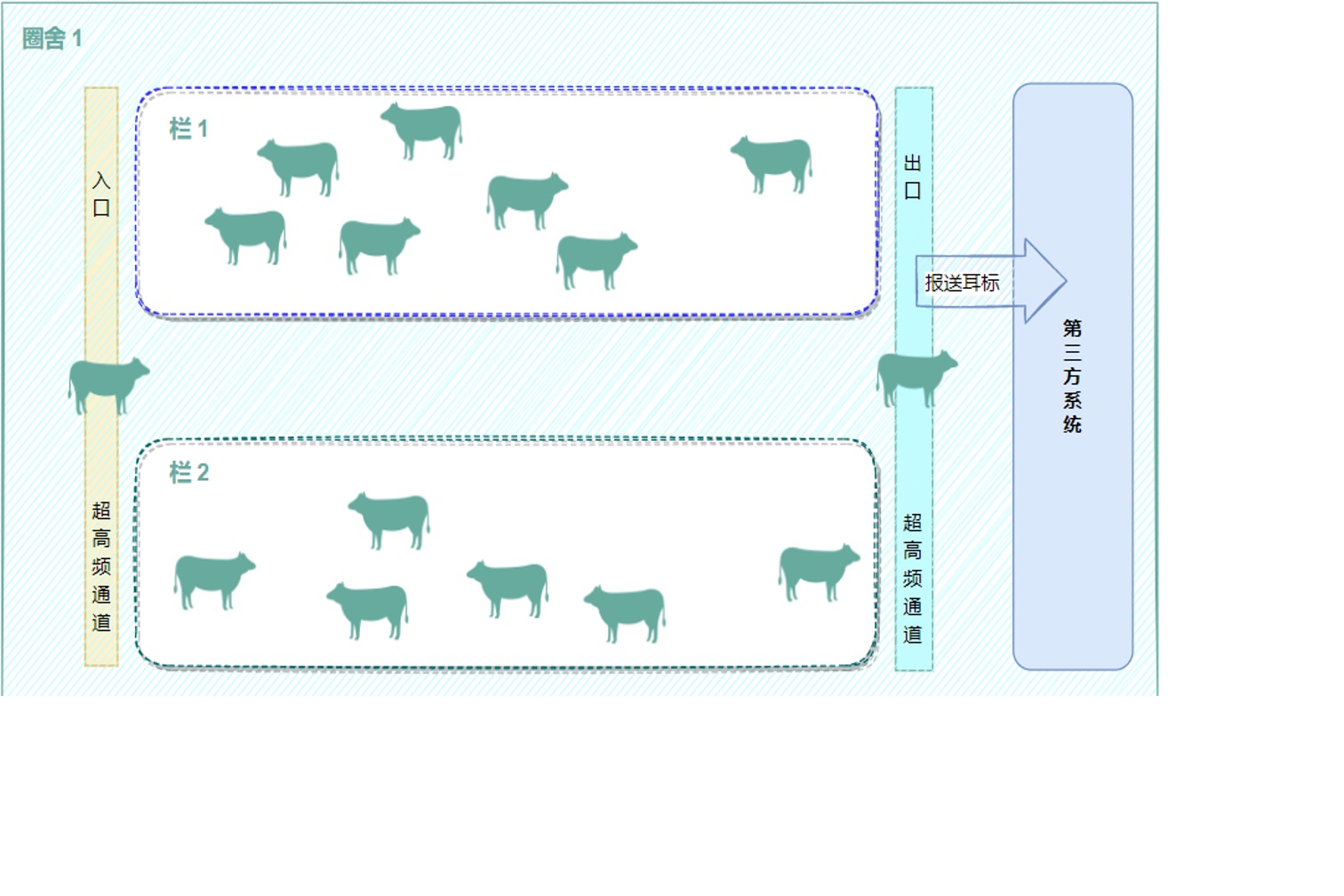 超高頻UHF耳標(biāo)應(yīng)用在圈舍入口及出口設(shè)立專用識別通道,需要管理的動物初戴耳標(biāo)后經(jīng)由通道時系統(tǒng)自動識別并注冊信息,在圈舍間轉(zhuǎn)移時也將由自動自動計數(shù)管理,并且這些信息也可報送第三方系統(tǒng),(如:動物監(jiān)管及金融保險)