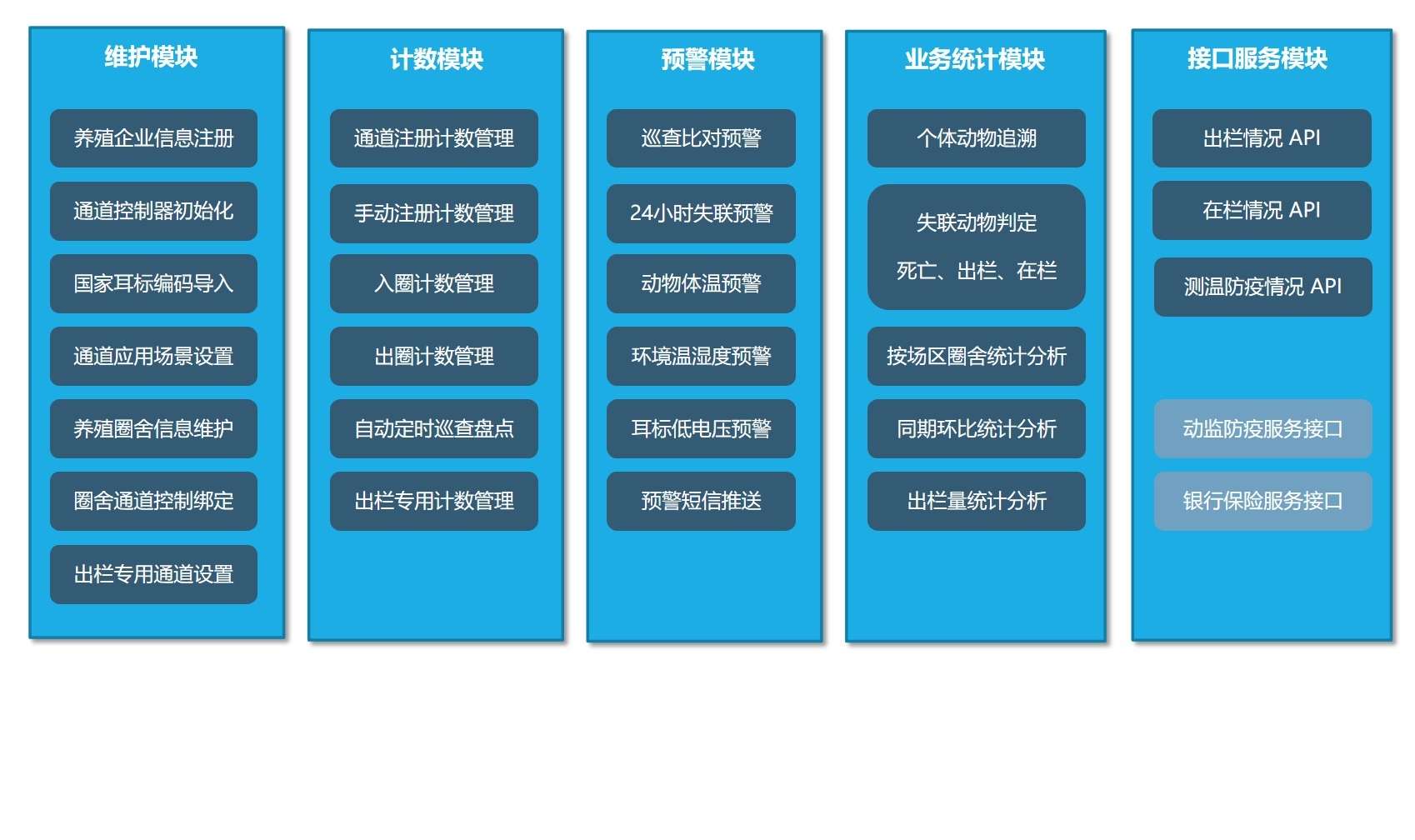 隨著科技的發(fā)展,傳統(tǒng)畜牧業(yè)迎來了牧聯(lián)網(wǎng)科技的新時代。深圳明華智能通道系統(tǒng)運(yùn)用超高頻RFID技術(shù)、4G北斗定位技術(shù)、溫濕度感應(yīng)技術(shù)及Iot物聯(lián)技術(shù)等現(xiàn)代流行技術(shù)為畜牧業(yè)養(yǎng)殖提供了高效的管理方式,從養(yǎng)殖牲畜個體身份的智能識別到實(shí)時測溫預(yù)警、體尺體重監(jiān)測以及存欄牲畜的自動巡查盤點(diǎn)、迅速完成入欄、回欄及出欄計數(shù)及各種養(yǎng)殖業(yè)務(wù)數(shù)據(jù)信息的精準(zhǔn)統(tǒng)計等,能夠?yàn)樾竽翗I(yè)養(yǎng)殖的現(xiàn)代化、智能化發(fā)展帶來新的幫助;而應(yīng)用智能監(jiān)管通道形成的電子監(jiān)管圍欄,可減少人工作業(yè)量,同時系統(tǒng)也可與防疫監(jiān)管部門及第三方銀行保險金融單位的各類監(jiān)管及風(fēng)控系統(tǒng)進(jìn)行API數(shù)據(jù)對接,提供有效準(zhǔn)確的數(shù)據(jù)參考價值。